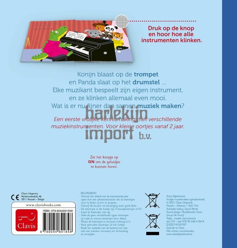 Een eerste vrolijk kennismaking met verschillende muziekinstrumenten. Voor kleine oortjes vanaf 2 jaar. Konijn blaast op een trompet en Panda slaat op het drumstel … Elk dier bespeelt zijn eigen instrument, en ze klinken allemaal even mooi. Maar wat is er nu fijner dan samen muziek maken?