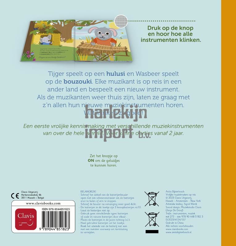 Tijger speelt op een panfluit en Wasbeer speelt op de banjo. Elk dier is op reis in een ander land en bespeelt een nieuw instrument. Als de muzikanten weer thuis zijn, laten ze graag met z’n allen hun nieuwe muziekinstrumenten horen. Wat klinken ze goed! Een vrolijke kennismaking met muziekinstrumenten van over de hele wereld. Voor kleine oortjes vanaf 2 jaar.