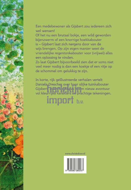 Met een bewoner als Gijsbert in je tuin is het nooit saai. De ene dag maakt hij bonje met de kat, de andere dag krijgt hij te maken met een wild geworden zwerm bijen. Om nog maar te zwijgen van die keer dat Gijsbert van de frambozenjam snoepte en vervolgens een spoor van rode plakkerige voetsporten achter zich liet. In korte, rijk geïllustreerde verhalen vertelt Daniela Drescher uit het leven van haar olijke tuinkabouter Gijsbert. Ieder hoofdstuk is een nieuw avontuur vol kleurrijke karakters en prachtige tekeningen.