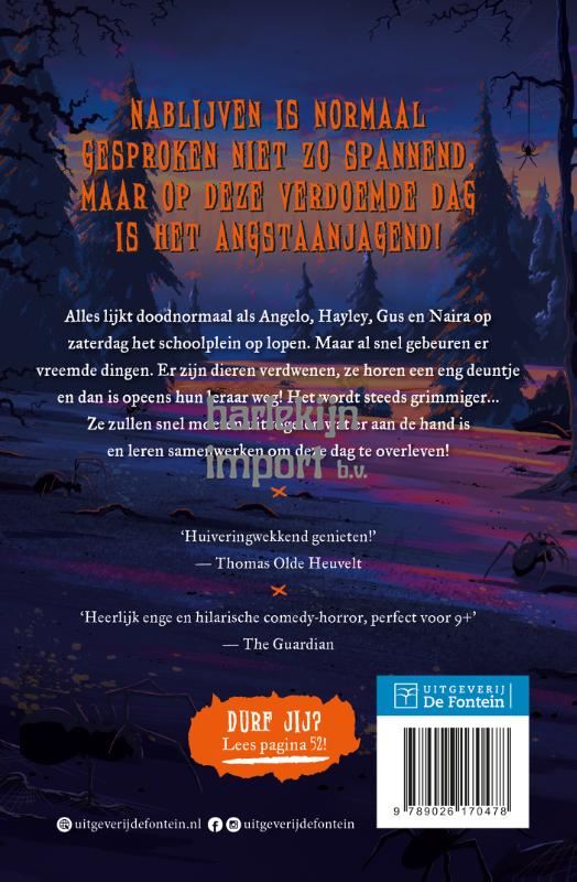 Nablijven is normaal gesproken niet zo spannend, maar deze verdoemde dag is het angstaanjagend! Als Angelo, Hayley, Guus en Naïra op zaterdag het schoolplein op lopen, lijkt alles doodnormaal. Maar al snel blijkt dit toch niet het geval te zijn... Er zijn dieren verdwenen, ze horen een eng deuntje en dan is opeens hun leraar weg! Komen ze er op tijd achter wat zich rondom de school afspeelt? En kunnen ze samenwerken om de dag te overleven?
