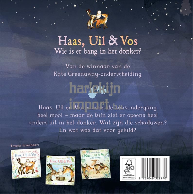 Haas, Uil & Vos Wie is er bang in het donker? Van de winnaar van de Kate Greenaway-onderscheiding Haas, Uil en Vos vinden de zonsondergang heel mooi – maar de tuin ziet er opeens heel anders uit in het donker. Wat zijn die schaduwen? En wat was dat voor geluid?