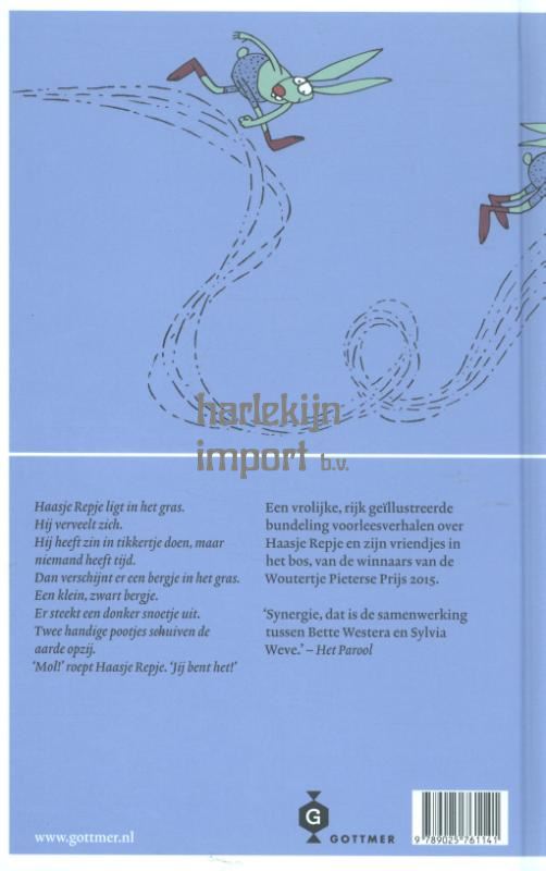 ‘Haasje Repje’ is een leuke bundel voorleesverhaaltjes van Bette Westera, geïllustreerd door Sylvia Weve (winnaars van de Woutertje Pieterse prijs 2015). Wie kan het hardste rennen? Haasje Repje speelt het liefst de hele dag wilde spelletjes met de andere dieren uit het bos. Tikkertje bijvoorbeeld, of wie het hardst kan rennen. Maar soms heeft niemand tijd: Merel moet een nest bouwen, Reiger wil vissen vangen. Alleen Slak heeft tijd – maar tikkertje spelen met Slak is wel een beetje saai… Bette Westera & Sylvia Weve Haasje Repje is een vrolijke bundeling voorleesverhalen van Bette Westera, die eerder verschenen onder de titel Ra ra, wie ben ik? Deze compleet herziene uitgave werd van nieuwe illustraties voorzien door Gouden Penseelwinnares Sylvia Weve. In 2015 ontving dit gouden duo de Woutertje Pieterse prijs voor hun dichtbundel Doodgewoon.