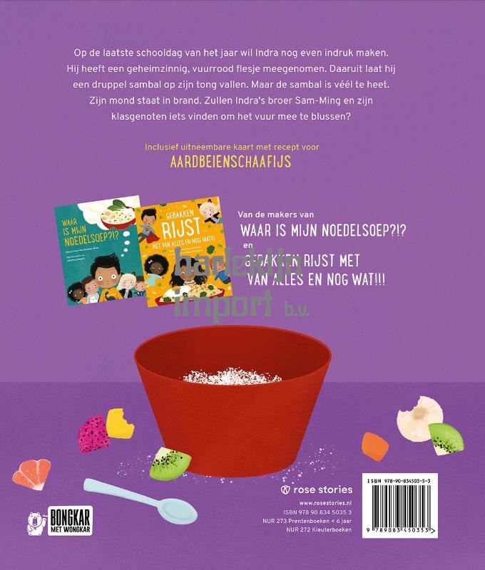 Op de laatste schooldag van het jaar wil Indra nog even indruk maken. Hij heeft een geheimzinnig, vuurrood flesje meegenomen. Daaruit laat hij een druppel sambal op zijn tong vallen. Maar de sambal is véél te heet. Zijn mond staat in brand. Zullen Indra's broer Sam-Ming en zijn klasgenoten iets vinden om het vuur mee te blussen? Inclusief uitneembare kaart met recept voor. AARDBEIENSCHAAFIJS Van de makers van WAAR IS MIJN NOEDELSOEP?!? en GEBAKKEN RIJST MET VAN ALLES EN NOG WAT!!!
