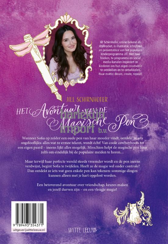 Beleef een betoverend avontuur vol verrassingen, vriendschap en een vleugje magie in Het avontuur van de magische pen van Jill. Boordevol prachtige illustraties van Jill zelf! Wanneer Sofia op zolder een oude pen van haar moeder vindt, ontdekt ze iets ongelooflijks: alles wat ze ermee tekent, wordt écht. Van hippe sneakers tot een eigen paard – ineens lijkt alles mogelijk. Misschien helpt de magische pen haar zelfs om eindelijk bij de populaire meiden te horen… Maar naarmate haar perfecte wereld steeds vreemder wordt en de pen ineens verdwijnt, begint Sofia te twijfelen: heeft ze de magie wel onder controle? En dan ontdekt ze iets wat geen enkele pen kan tekenen: dat sommige dingen alleen vanbinnen opgelost kunnen worden. Jill Schirnhofer, bekend van haar creatieve kinderprogramma Jill, waar sinds 2014 kinderen in Nederland en België mee zijn opgegroeid, heeft al meer dan twintig geïllustreerde teken- en doeboeken op haar naam staan. Ze speelde in de films en jeugdserie Misfit en heeft haar eigen lijn DIY-producten. Via haar social media kanalen deelt ze tekentips, inspiratie en haar creatieve kijk op haar omgeving. Het is haar missie haar doelgroep te stimuleren zelf aan de slag te gaan en hen daarbij ook de handvatten te geven om hun eigen authentieke stijl te vinden. Haar slogan is dan ook: dream, create, repeat!