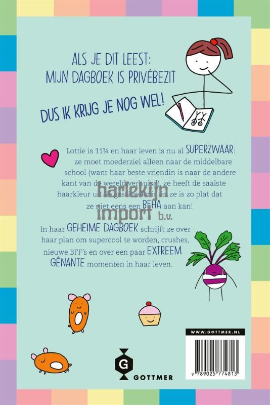 Lottie gaat naar de eerste klas, moederziel alleen, omdat haar beste vriendin haar heeft verlaten. Of nou ja, ze is verhuisd. Lottie is ook nog eens zo plat dat ze niet eens een bh aan kan. Hoe moet dat nou? Lottie verzint een plan. Ze gaat zichzelf opnieuw uitvinden, zodat ze razend populair wordt. Of, als dat niet lukt: interessant genoeg om in ieder geval één vriendin te vinden. Want dan hoeft ze tenminste niet alleen op de wc te lunchen. Lottie is de hilarische hoofdpersoon van dit hartverwarmende boek over de grote gevaren van het tienerleven. In haar dagboek neemt ze je mee op haar chaotische reis naar de middelbare. ‘Het extreem gênante leven van Lottie’ zit vol herkenbare onzekerheden en ongemakkelijke situaties. Katie Kirby brengt met haar humor en illustraties moeiteloos over hoe het is om op te groeien.