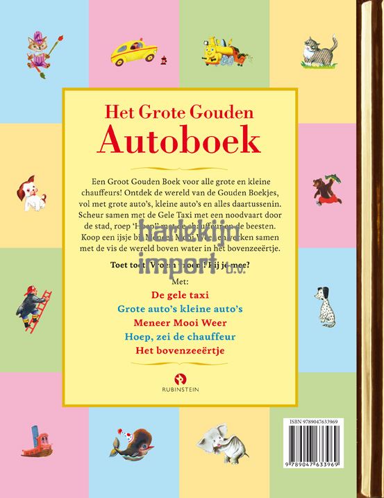 Een Groot Gouden Boek voor alle grote en kleine chauffeurs! Scheur samen met de Gele Taxi met een noodvaart door de stad, roep ‘Hoep!’ met de chauffeur en de beesten. Koop een ijsje bij Meneer Mooi Weer en verken samen met de vis de wereld boven water in het Bovenzeeërtje. En natuurlijk ontbreekt ook het ultieme Gouden Boekje over auto’s niet: Grote auto’s, kleine auto’s.