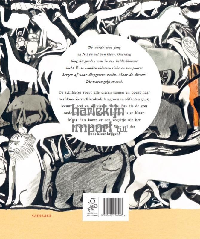 Een magisch prentenboek over schoonheid, natuur en creativiteit. De aarde was jong en fris en vol van kleur. Overdag hing de gouden zon in een helderblauwe lucht. Er stroomden zilveren rivieren van paarse bergen af naar diepgroene zeeën. Maar de dieren! Die waren grijs en saai. De schilderes roept alle dieren samen en opent haar verfdoos. Ze verft krokodillen groen en olifanten grijs; leeuwen geel en walvissen blauw. Pas als de zon ondergaat en alle kleuren op zijn, is ze klaar. Maar dan komt er een vogeltje uit het donkere bos gevlogen. Wat zal dat voor kleur krijgen?