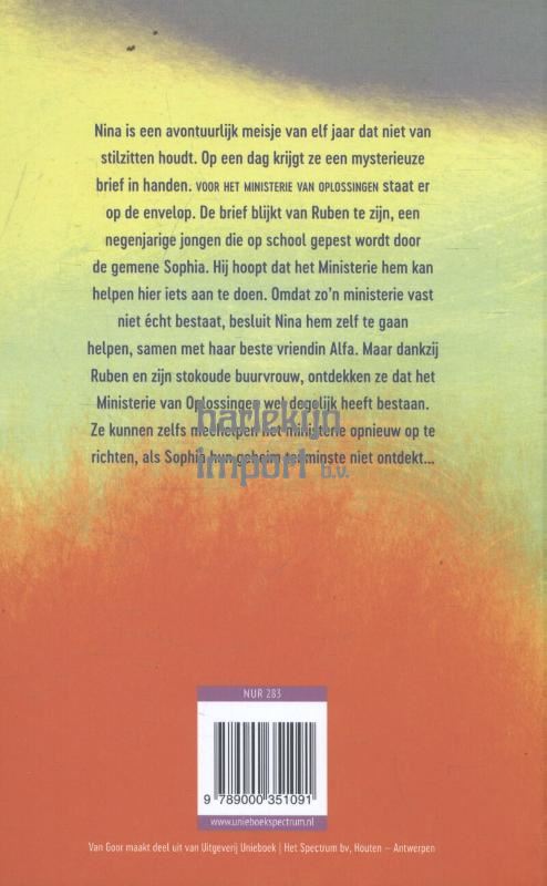 Nina is een avontuurlijk meisje van 11 jaar dat niet van stilzitten houdt. Haar vader is postbode en als hij op een dag een brief aan het mysterieuze Ministerie van Oplossingen mee naar huis neemt, schreeuwt die er natuurlijk om gelezen te worden. De brief is van de 9-jarige Ruben die op school gepest wordt door de gemene Sophia en haar vriendinnen. Hij hoopt dat het ministerie hem kan helpen dit op te lossen. Nina besluit dan om samen met haar beste vriendin, Alfa, Ruben te gaan helpen, aangezien zo’n ministerie natuurlijk niet echt bestaat. Maar dankzij Ruben en zijn stokoude buurvrouw ontdekken ze dat ze zich daarin vergissen: er heeft wel degelijk een Ministerie van Oplossingen bestaan. Ze kunnen zelfs meehelpen aan het opnieuw oprichten ervan, als Sophia hun geheim tenminste niet ontdekt…