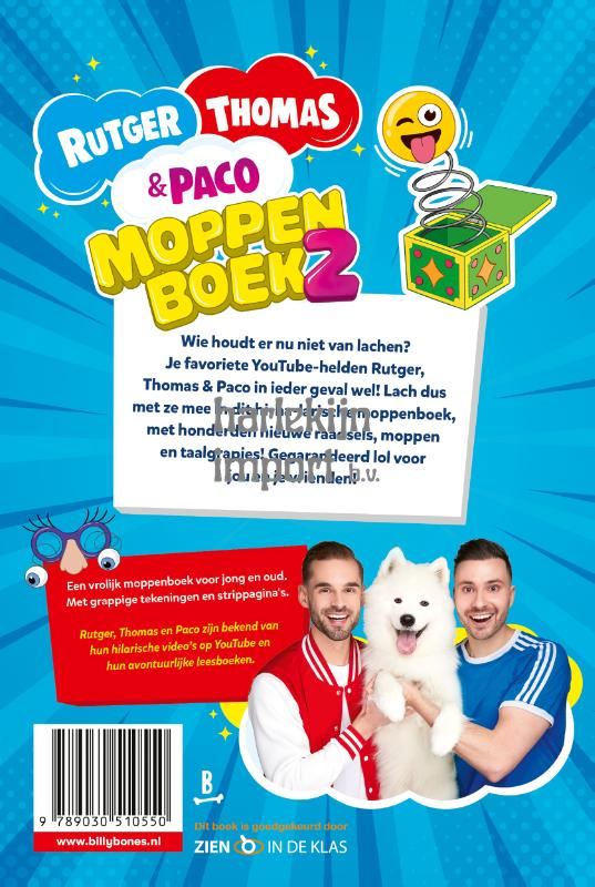 <p><span data-teams="true">Rutger, Thomas en Paco zijn bekend van hun hilarische video’s op YouTube en hun avontuurlijke leesboeken. ‘De avonturen van Rutger, Thomas & Paco’ is dé succesvolle en prijswinnende kinderboekenserie van nu. Met De Magische Halsband (2022), De Tijdmachine (2023) en Het Pretpark (2024) won de serie drie jaar op rij de Prijs van de Nederlandse Kinderjury. Deze prijs wordt volledig door kinderen zelf bepaald en is de belangrijkste publieksprijs van Nederland. De Safari, het vierde boek, stond meteen wekenlang in de top 3 van de Bestseller 60. Ook zijn de eerste drie delen bekroond met een Gouden Boek. Voor kinderboeken betekent dit dat er meer dan 75.000 exemplaren zijn verkocht. En deel 1 heeft inmiddels zelfs een Platina Boek op zijn naam: 150.000 exemplaren!</span></p> <p>Wie houdt er nu niet van een grapje op zijn tijd? Je favoriete YouTube-helden Rutger, Thomas en Paco in elk geval wel!<span class="Apple-converted-space"> </span></p> <p>Na het succes van het eerste moppenboek zijn ze terug met gloednieuwe grappen en grollen. Lach dus met ze mee in dit hi-ha-larische moppenboek!<span class="Apple-converted-space"> </span></p> <p>Met honderden nieuwe raadsels, moppen en taalgrapjes gesorteerd op thema. Zo vind je voor ieder moment een geschikte grap! En het boek staat ook nog eens bomvol illustraties en strips. Gegarandeerd de slappe lach voor jou en je vrienden, wat wil je nog meer?!<span class="Apple-converted-space"> </span></p>