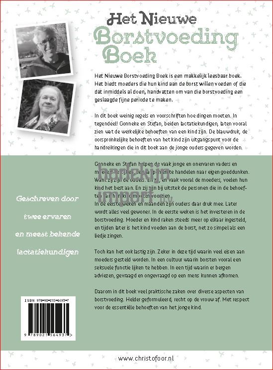 Het Nieuwe Borstvoeding Boek is een makkelijk leesbaar boek. Het biedt ouders van kinderen die zich aan de borst voeden of willen gaan voeden, -en zeg nou eerlijk: welk kind wil dat niet?- handvatten om van die borstvoeding een geslaagde fijne periode te maken. Dit boek biedt óók handvatten aan ouders die niet willen, mogen of kunnen borstvoeden. Er staan geen regels in dit boek. Integendeel! Gonneke en Stefan, beiden lactatiekundigen, laten je zien wat je kunt doen om de werkelijke behoeften van je kind te ontdekken en daar naar te handelen. De blauwdruk, de oorspronkelijke behoeften van jouw kind zijn uitgangspunt voor de handreikingen die in dit boek aan de jonge ouders gegeven worden. Ze nemen daarbij geen blad voor de mond.