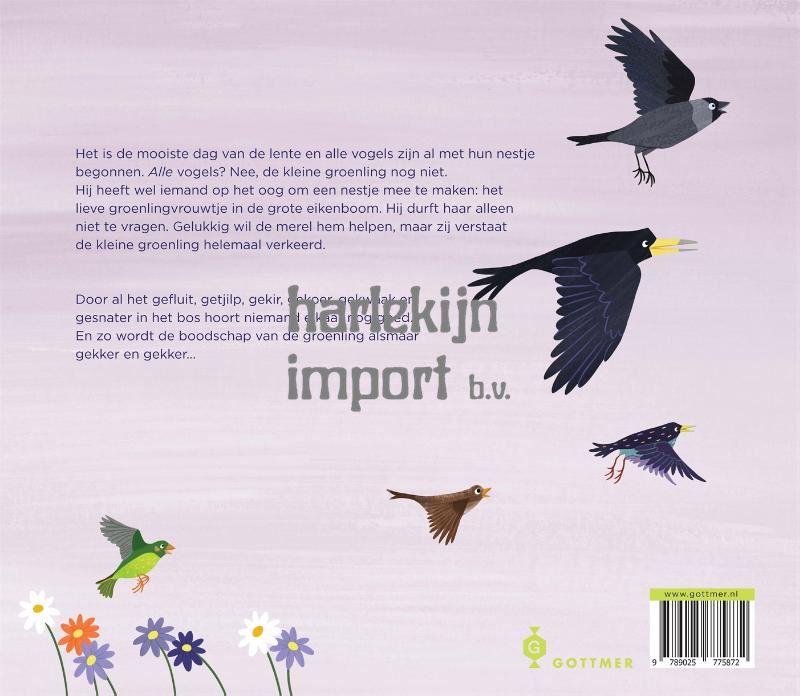 Het is een herrie van jewelste in het bos: alle vogels zijn luid fluitend een nestje aan het bouwen. De kleine groenling nog niet. Hij is te verlegen om het groenlingvrouwtje te vragen of ze met hem een nestje wil beginnen. Hij vraagt de merel om hulp, maar met al dat gesnater verstaat zij hem helemaal verkeerd! En de kauw hoort ook iets heel anders dan wat de merel zegt. En de roek verstaat de kauw weer niet... Al snel vliegt iedereen in een lange slinger door het bos, over de wei, het landgoed en naar het strand. Met helemaal achteraan de verlegen groenling. Komt het nog goed?