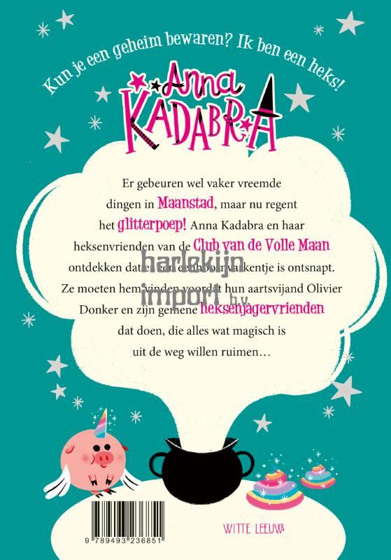 Er gebeuren wel vaker vreemde dingen in Maanstad, maar nu regent het glitterpoep! Anna Kadabra en haar heksenvrienden van de Club van de Volle Maan ontdekken dat er een eenhoornvarkentje isontsnapt. Ze moeten hem vinden voordat hun aartsvijand Olivier Donker en zijn gemene Heksenjagervrienden dat doen, die alles wat magisch is uit de weg willen ruimen… Alleen bij de eerste druk: een betoverende glitterpen!