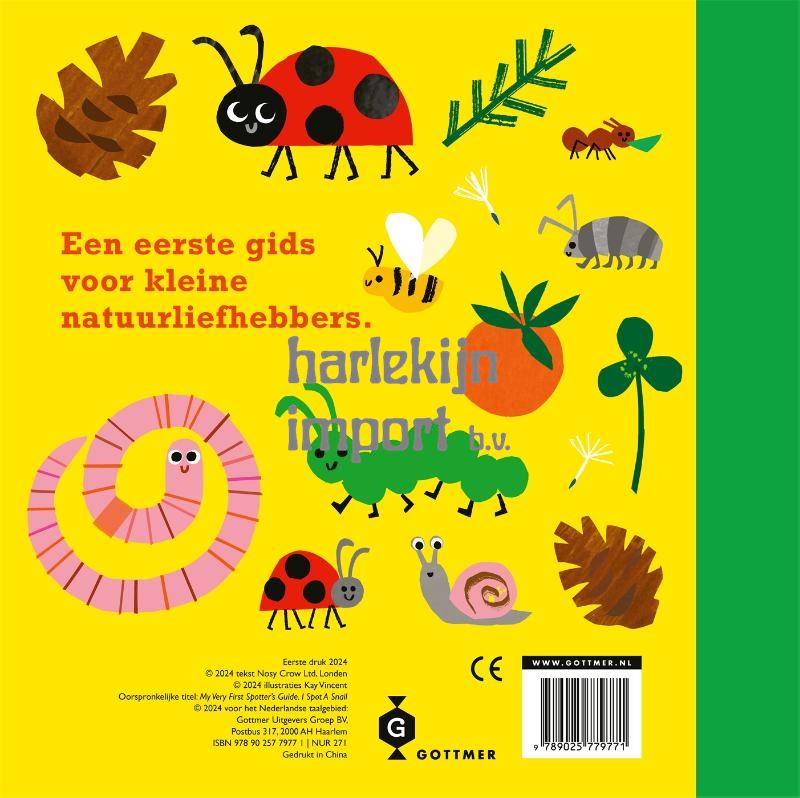 Spot met 'Ik zie een slak' diverse soorten dieren en insecten in de natuur dicht bij huis. Deze toegankelijke non-fictieserie 'Mijn eerste natuurgids' introduceert peuters tot de boeiende wereld van dieren die in de dagelijkse wereld van kinderen voorbij kunnen komen. Met grote flappen en een interactieve vraag-en-antwoordtekst is dit boek speciaal ontworpen om peuters te helpen bij het herkennen van slakken, wormen en insecten in de natuur. Het boek geeft het antwoord op vragen zoals 'Waar leven slakken?', 'Hoe groot is een vlinder?' en' Hoeveel poten heeft een spin?' Jonge kindjes worden uitgenodigd om deze vragen te beantwoorden en de verschillende beestjes te identificeren. In deze toegankelijke serie leren peuters over alle fascinerende dieren in hun directe omgeving. 'Ik zie een slak' is het tweede deel in de leerzame Mijn eerste natuurgids-serie voor kinderen vanaf 18 maanden. Deze eerste dieren- en insectengids met vrolijke illustraties en eenvoudige taal is ideaal voor jonge natuurliefhebbers in de dop. Lees ook: 'Mijn eerste natuurgids - Ik zie een eend'.