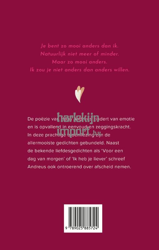 Je bent zo mooi anders dan ik.Natuurlijk niet meer of minder.Maar zo mooi anders.Ik zou je nooit anders dan anders willen. Deze prachtige bloemlezing uit het oeuvre van Hans Andreus (1926-2977) bevat zijn allermooiste gedichten.Naast de bekende liefdesgedichten zoals ‘Voor een dag van morgen’, ‘Ik heb je liever’ en ‘Je bent zo’ bevat dezebloemlezing ook liefdevolle observaties over afscheid nemen. De poëzie van Andreus zindert van emotie en isopvallend in eenvoud en zeggingskracht.