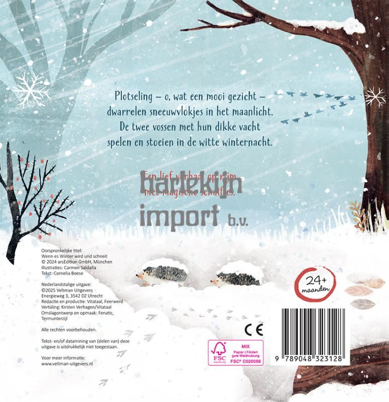 Plotseling – o, wat een mooi gezicht – dwarrelen sneeuwvlokjes in het maanlicht. De twee vossen met hun dikke vacht spelen en stoeien in de witte winternacht. Een lief verhaal op rijm met magische schuifjes.