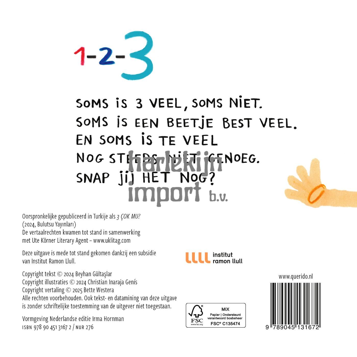 Is drie te veel? Drie brillenglazen bijvoorbeeld, of drie bolletjes ijs? Met z’n drieën is de achterbank best vol, maar de lucht met drie sterren is bijna leeg. Drie is gek: soms een heleboel, soms heel weinig – het is maar net hoe je het bekijkt. Dit speelse kartonboek stelt telkens de vraag of drie veel is of juist weinig. Op elke pagina die je openvouwt vind je een antwoord, een wending, een grap… of een feest!