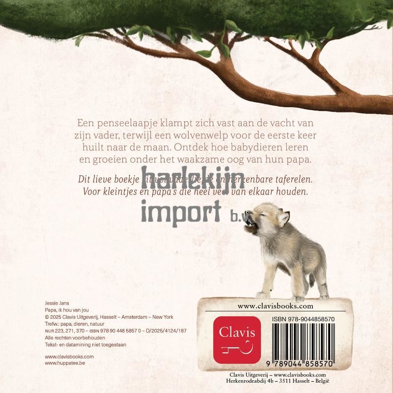 Een penseelaapje klampt zich vast aan de vacht van zijn vader, terwijl een wolvenwelp voor de eerste keer huilt naar de maan. Ontdek hoe babydieren leren en groeien onder het waakzame oog van hun papa. Dit lieve boekje zit vol vaderliefde en herkenbare taferelen. Voor kleintjes en papa’s die heel veel van elkaar houden.