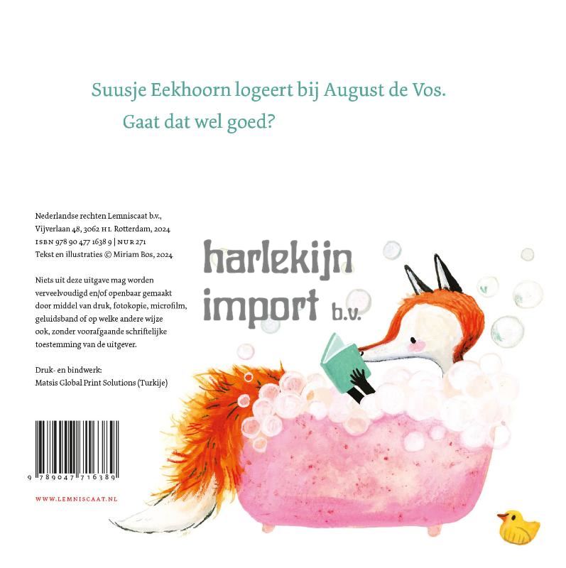 Miriam Bos brak door met Help! Een verrassing!, het eerste boek over August en Suus. Het verhaal over de introverte vos en de extraverte eekhoorn vond heel wat weerklank: niet voor niets werd het uitgeroepen tot Prentenboek van het Jaar. Zo maakten al veel kinderen kennis met dit olijke duo. Voor hun jongere broertjes en zusjes maakte Miriam Bos een kartonboekje waarbij Suus de boel weer flink op stelten zet. Ze komt logeren bij August. Of die daarop zit te wachten is maar de vraag… Wordt het een leuk logeerpartijtje of kan Suus voortaan beter thuisblijven? Eén ding is zeker: het is nooit saai met zo’n stuiterende eekhoorn op bezoek!