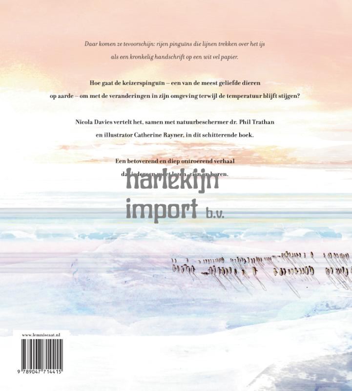 Hoe gaat de keizerspinguïn – een van de meest geliefde dieren op aarde – om met de veranderingen in zijn omgeving naarmate de temperatuur blijft stijgen? Terwijl de strenge winter neerdaalt en andere vogels naar de warmte trekken, verschijnen op Antarctica rijen keizerspinguïns op zoek naar het perfecte ijs om te broeden en hun kuikens groot te brengen. Maar dat ijs is aan het verdwijnen door de opwarming van de aarde. Het boeiende verhaal van Nicola Davies, prachtig geïllustreerd door Catherine Rayner, volgt een keizerspinguïnkoppel dat samen een kuiken ter wereld brengt in een omgeving die snel verandert. Het is een verhaal dat vertedert en tot nadenken stemt – en dat elke lezer zal aansporen om te helpen het milieu te beschermen zodat deze buitengewone dieren nog generaties lang in Antarctica kunnen leven. Een betoverend en diep ontroerend verhaal dat iedereen moet lezen, zien en horen.