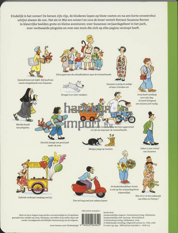 Eindelijk is het zomer! De kersen zijn rijp, de kinderen lopen op blote voeten en na een korte onweersbui schijnt alweer de zon. Net als in Wat een winter! en Leve de lente! vertelt Rotraut Susanne Berner in kleurrijke beelden grote en kleine avonturen: over Susannes verjaardagsfeest in het park, over verdwaalde pinguïns en over een muis die zich op elke pagina verstopt heeft.