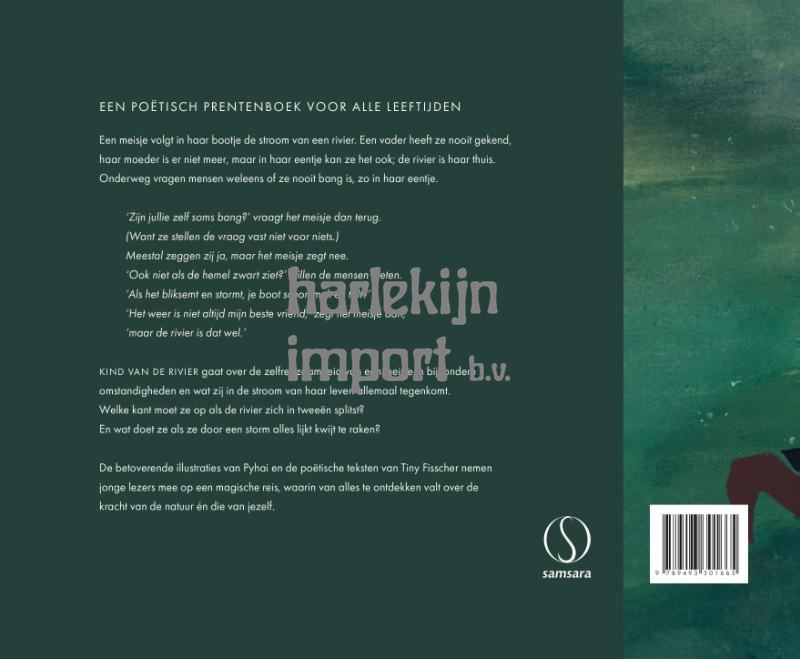 EEN POËTISCH PRENTENBOEK VOOR ALLE LEEFTIJDEN Een meisje volgt in haar bootje de stroom van een rivier. Een vader heeft ze nooit gekend, haar moeder is er niet meer, maar in haar eentje kan ze het ook. De rivier is haar thuis, maar onderweg vragen mensen weleens of ze nooit bang is, zo in haar eentje. ‘Zijn jullie zelf soms bang?’ vraagt het meisje dan terug. (want ze stellen de vraag vast niet voor niets). Meestal zeggen zij ja, maar het meisje zegt nee. ‘Ook niet als de hemel zwart ziet?’ willen de mensen weten. ‘Als het bliksemt en stormt, je boot schommelt en tolt?’ ‘Het weer is niet altijd mijn beste vriend,’ zegt het meisje dan, ‘maar de rivier is dat wel.’ KIND VAN DE RIVIER gaat over de zelfredzaamheid van een meisje in bijzondere omstandigheden en wat zij in de stroom van haar leven allemaal tegenkomt. Welke kant moet ze op als de rivier zich in tweeën splitst? En wat doet ze als ze door een storm alles lijkt kwijt te raken? De betoverende illustraties van Pyhai en de poëtische teksten van Tiny Fisscher nemen jonge lezers mee op een magische reis, waarin van alles te ontdekken valt over de kracht van de natuur én die van jezelf. Na hun zeer goed ontvangen bewerking van Khalil Gibrans DE PROFEET, hebben Tiny Fisscher en Pyhai opnieuw hun krachten gebundeld. Het betoverende prentenboek KIND VAN DE RIVIER is daarvan het resultaat.
