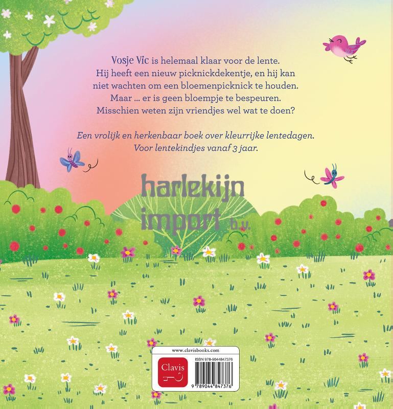 Vosje Vic is helemaal klaar voor de lente. Hij heeft een nieuw picknickdekentje, en hij kan niet wachten om een bloemenpicknick te houden. Maar … er is geen bloempje te bespeuren. Misschien weten zijn vriendjes wel wat te doen? Een vrolijk en herkenbaar boek over kleurrijke lentedagen. Voor lentekindjes vanaf 3 jaar.