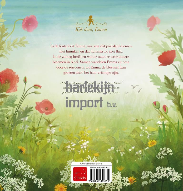 In de lente leert Emma van oma dat paardenbloemen niet hinniken en dat fluitenkruid niet fluit. In de zomer, herfst en winter staan er weer andere bloemen in bloei. Samen wandelen Emma en oma door de seizoenen, tot Emma de bloemen kan groeten alsof het haar vriendjes zijn. Het eerste, kleurrijke deel uit de serie ‘Kijk daar, Emma’ over de bloeitijden van bloemen, vol woordgrapjes en fantasierijke illustraties. Voor kinderen vanaf 4 jaar.