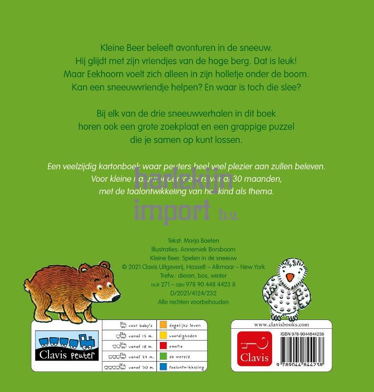 Kleine Beer beleeft avonturen in de sneeuw. Hij glijdt met zijn vriendjes van de hoge berg. Dat is leuk! Maar Eekhoorn voelt zich alleen in zijn holletjes onder de boom. Kan een sneeuwvriendje helpen? En waar is toch die slee? Bij elk van de drie sneeuwverhalen in dit boek hoort ook een grote zoekplaat en een grappige puzzel die je samen op kunt lossen. Een veelzijdig kartonboek waar peuters heel veel plezier aan zullen beleven. Voor kleine natuuronderzoekers vanaf 30 maanden, met de taalontwikkeling van het kind als thema.