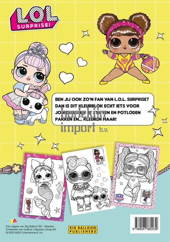 Dompel je onder in de betoverende wereld van L.O.L. Surprise in dit 'L.O.L. Surprise! kleurblok'. Breng je favoriete LOL-pop tot leven in deze supercoole kleurplaten. Grijp je kleurpotloden of stiften en ga aan de slag! Wat is er nou fijner dan een middagje kleuren aan de keukentafel? Met een kleur- of doeboek ontwikkelen kinderen niet alleen hun motoriek, maar ook hun creativiteit en fantasie. En ze maken nog iets moois ook! Bekijk ook de rest van onze collectie kleurboeken en kleurblokken voor kinderen, van bekende karakters als Gabby's Poppenhuis, Bluey of Paw Patrol. Dat betekent nog meer kleurrijke avonturen en creatief plezier voor jonge kunstenaars.
