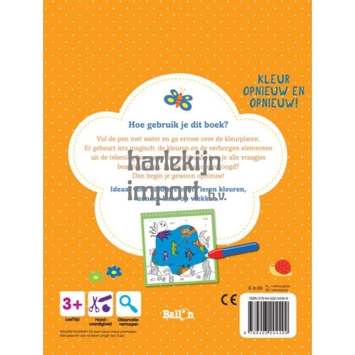 Vul de bijhorende pen met water en kleur ermee op de pagina’s.