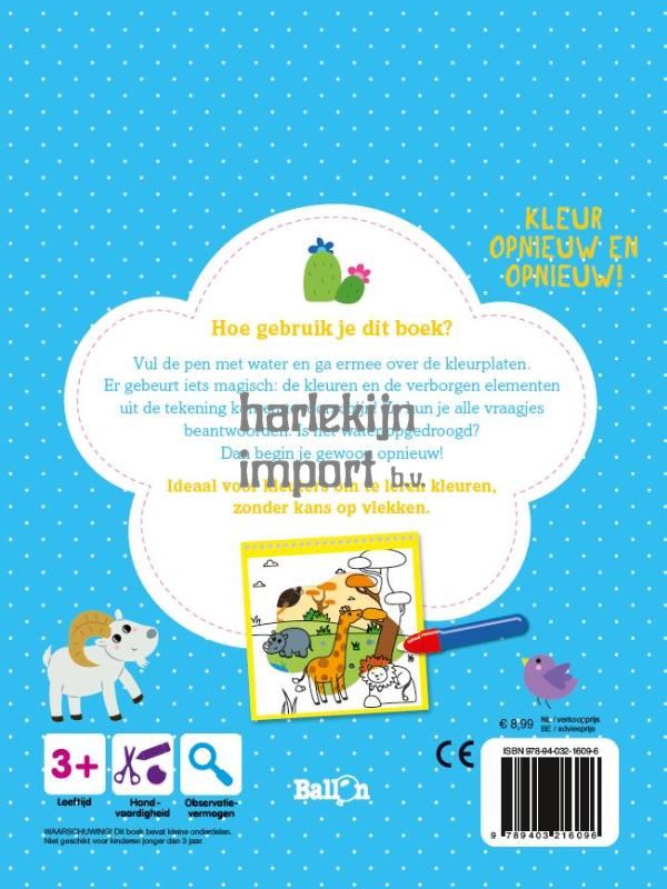 Vul de bijhorende pen met water en kleur ermee op de pagina’s.