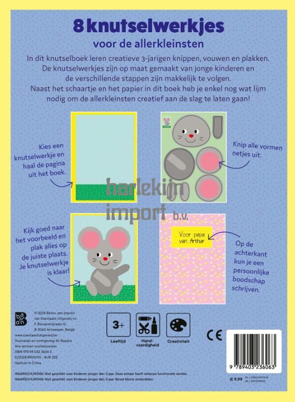 In dit knutselboek leren creatieve 3-jarigen knippen, vouwen en plakken. De knutselwerkjes zijn op maat gemaakt van jonge kinderen en de verschillende stappen zijn makkelijk te volgen. Naast het schaartje en het papier in dit boek heb je enkel nog wat lijm nodig om de allerkleinsten creatief aan de slag te laten gaan! Kies een knutselwerkje en haal de pagina uit het boek. Knip alle vormen netjes uit. Kijk goed naar het voorbeeld en plak alles op de juiste plaats. Je knutselwerkje is klaar! Op de achterkant kun je een persoonlijke boodschap schrijven.