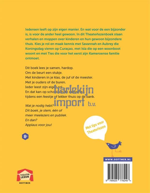 In dit Theaterleesboek staan 20 verhalen over kinderen en hun gewoon bijzondere thuis. Kies je rol en vier Koningsdag op CuraƧao met Savannah en Aubrey, leef mee met Isla die op een woonboot woont of met Ties die voor het eerst kennismaakt met zijn Kameroense familie. Theaterlezen doe je samen, thuis of in de klas. Alle verhalen in dit boek staan los van elkaar en zijn erop gericht ermee op te treden. Zonder podium, maar met elkaar, waar je maar wilt! Door het oefenen voor een optreden wordt herhaling van de tekst gestimuleerd en door het inleven in een rol verbetert het begrip en de intonatie ervan. De verhalen worden afgewisseld met moppen, en elke tekst heeft een praatvraag om samen verder in gesprek te gaan. Past perfect bij het thema van de Kinderboekenweek 2023!