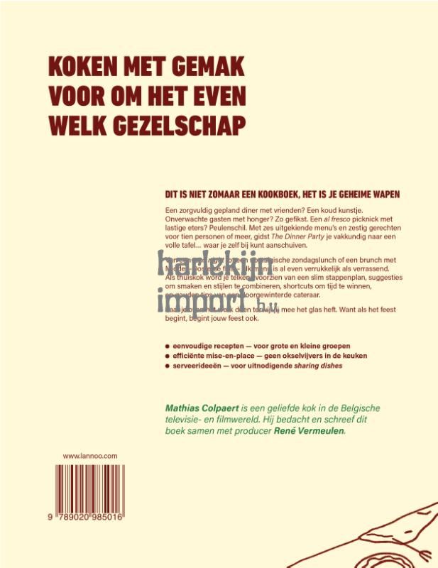 Weekendje weg met de vrienden? Een feestje met de collega's? Of de lieftallige schoonfamilie over de vloer? Koken voor een grote groep kan stressvol zijn - maar dit boek bewijst dat het ook anders kan! Maak van jouw volgende dinner party een écht feest, zonder dat je als gastheer of -vrouw de hele avond vastzit in de keuken. Met 6 originele menu's bestaande uit telkens 10 sharing recepten, tover je elke feesttafel in een mum van tijd om tot een waar culinair walhalla. Geen strakke kookregels of ingewikkelde technieken, wel eenvoudige, modulaire recepten die je kunt aanpassen naargelang het aantal feestvierders. Dankzij een slimme voorbereiding en tal van handige 'dips en tricks', schuif je als chef zelf ontspannen mee aan tafel - al vanaf de eerste hapjes. Of je nu een een uitbundige streetfood party geeft, een nostalgisch familiediner met koude plats organiseert of gaat voor Oosterse shared dining: als het feest begint, begint jouw feest ook. Let's go!