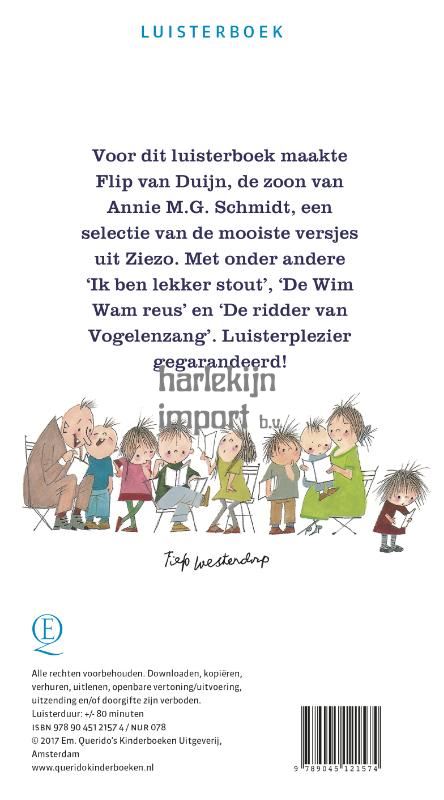 Voor dit luisterboek maakte Flip van Duijn, de zoon van Annie M.G. Schmidt, een selectie van de mooiste versjes uit Ziezo. Met onder andere "Ik ben lekker stout', "De Wim Wam reus' en "De ridder van Vogelenzang'. Luisterplezier gegarandeerd!