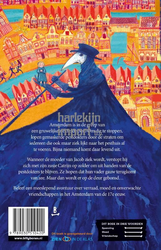 <p><strong>Nieuwe uitgave ter ere van 750 jaar Amsterdam!</strong></p> <p>Amsterdam is in de greep van een gruwelijke ziekte: de pest. Om die te stoppen, lopen gemaskerde pestdokters door de straten om iedereen die ook maar ziek lijkt naar het pesthuis af te voeren. Bijna niemand komt daar levend uit. </p> <p>Wanneer de moeder van Jacob ziek wordt, verstopt hij zich met zijn zusje Catrijn op zolder om uit handen van de pestdokters te blijven. Ze hopen dat hun vader gauw terugkomt van zee. Maar dan wordt er op de deur gebonsd…</p> <p>Beleef een meeslepend avontuur over verraad, moed en onverwachte vriendschappen in het Amsterdam van de 17e eeuw.</p>