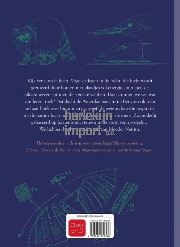 Kijk eens om je heen. Vogels vliegen in de lucht, die lucht wordt gezuiverd door bomen met blaadjes vol energie, en tussen de takken weven spinnen de sterkste webben. Daar kunnen we wel wat van leren, toch? Dat dacht de Amerikaanse Janine Benyus ook toen ze haar boek over biomimicry schreef: de wetenschap die inspiratie uit de natuur haalt om ideeën op te doen voor de mens. Zwemkledij gebaseerd op haaienhuid, treinen in de vorm van ijsvogels … We hebben heel wat te danken aan Moeder Natuur. Het negende deel in de serie over wetenschappelijke verwondering. Dromen, durven, denken én doen. Voor onderzoekers en na-apers vanaf 6 jaar.