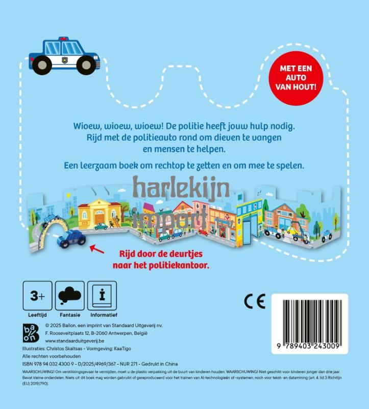Wioew, wioew, wioew! De politie heeft jouw hulp nodig. Rijd met de politieauto rond om dieven te vangen en mensen te helpen. Een leerzaam boek om rechtop te zetten en om mee te spelen.