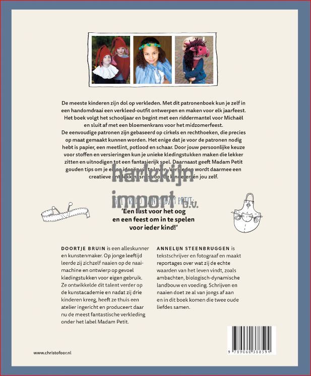 De meeste kinderen zijn dol op verkleden. Met dit patronenboek kun je zelf in een handomdraai een verkleed-outfit ontwerpen en maken voor elk jaarfeest. Het boek volgt het schooljaar en begint met een riddermantel voor Michaël en sluit af met een bloemenkrans voor het midzomerfeest. De eenvoudige patronen zijn gebaseerd op cirkels en rechthoeken, die precies op maat gemaakt kunnen worden. Het enige dat je voor de patronen nodig hebt is papier, een meetlint, potlood en schaar. Door jouw persoonlijke keuze voor stoffen en versieringen kun je unieke kledingstukken maken die lekker zitten en uitnodigen tot een fantasierijk spel. Daarnaast geeft Madam Petit gouden tips om je eigen ideeën uit te leven. Verkleden wordt daarmee een creatieve ontdekkingsreis voor de kinderen én jou zelf. Het credo van Madam Petit: “Een lust voor het oog en een feest om in te spelen voor ieder kind!”
