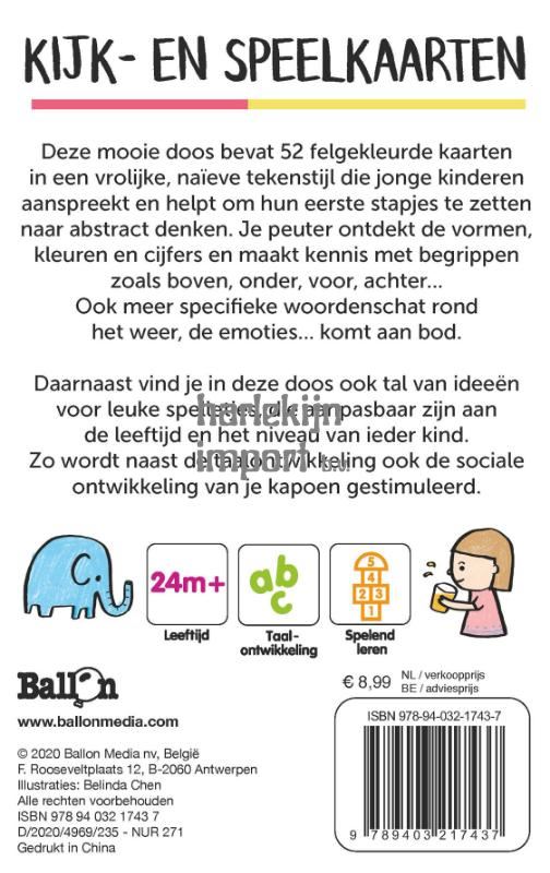 Deze mooie doos bevat 52 felgekleurde kaarten in een vrolijke, naïeve tekenstijl die jonge kinderen aanspreekt en helpt om nieuwe woordjes te leren op een speelse manier. Naast 100 woordjes die nauw aansluiten bij de leefwereld van je peuter, vind je in deze doos ook tal van ideeën voor leuke spelletjes, die aanpasbaar zijn aan de leeftijd en het niveau van ieder kind. Zo wordt naast de taalontwikkeling ook de sociale ontwikkeling van je kapoen gestimuleerd.