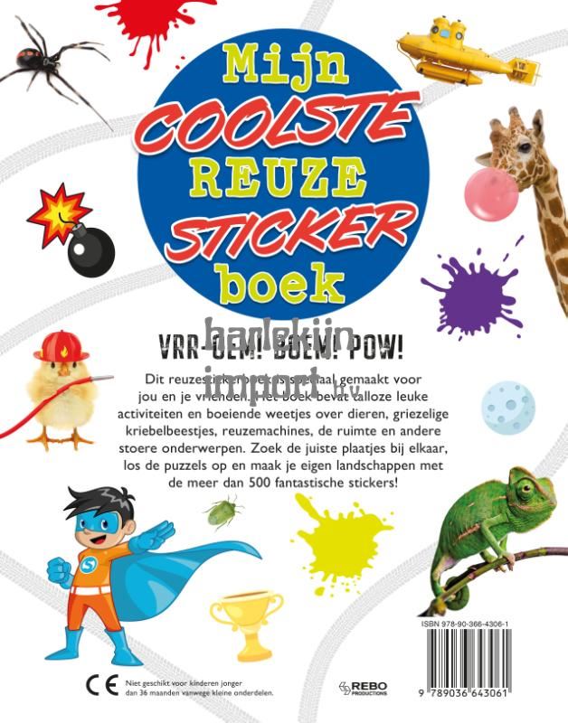 Dit reuzestickerboek is speciaal gemaakt voor jou en je vrienden. Het boek bevat talloze leuke activiteiten en boeiende weetjes over dieren, griezelige kriebelbeestjes, reuzemachines, de ruimte en andere stoere onderwerpen. Zoek de juiste plaatjes bij elkaar, los de puzzels op en maak je eigen landschappen met de meer dan 500 fantastische stickers!