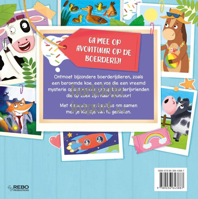 Ga mee op avontuur op de boerderij! Ontmoet bijzondere boerderijdieren, zoals een beroemde koe, een vos die een vreemd mysterie oplost en een groep boerderijvrienden die op zoek zijn naar avontuur! Met 4 speelse verhaaltjes om samen met je kleintje van te genieten.