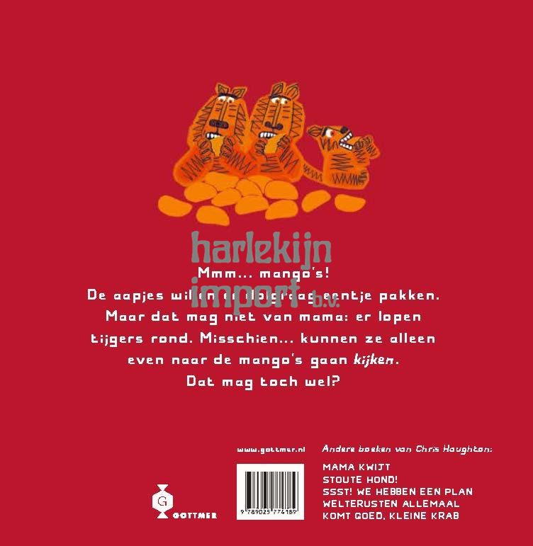Mmm, mango’s! De kleine aapjes zijn er dol op. Ze willen niets liever dan hun tandjes in zo’n grote, sappige mango zetten. Maar mama heeft duidelijk gezegd dat het niet mocht. Het is namelijk heel gevaarlijk! Er loeren tijgers in de buurt. Misschien… kan het geen kwaad om alleen even naar de mango’s te gaan kijken. Dat kan toch wel? Misschien? De eigenwijze stijl en droge humor van Chris Haughton spatten weer van de pagina’s. Zijn prentenboek ‘Mama kwijt’ werd Prentenboek van het Jaar 2012 en ook ‘Komt goed, kleine krab’ is inmiddels een echte klassieker.