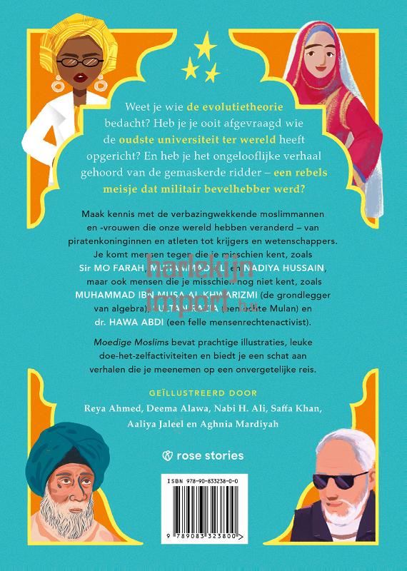 Weet je wie de evolutietheorie bedacht? Heb je je ooit afgevraagd wie de oudste universiteit ter wereld heeft opgericht? En heb je het ongelooflijke verhaal gehoord van de gemaskerde ridder – een rebels meisje dat militair bevelhebber werd? Maak kennis met de verbazingwekkende moslimmannen en -vrouwen die onze wereld hebben veranderd – van piratenkoninginnen en atleten tot krijgers en wetenschappers. Je komt mensen tegen die je misschien kent, zoals Sir MO FARAH, MUHAMMAD ALI en NADIYA HUSSAIN,maar ook mensen die je misschien nog niet kent, zoals MUHAMMAD IBN MUSA AL-KHWARIZMI (de grondlegger van algebra), SULTAN RAZIA (een echte Mulan) en dr. HAWA ABDI (een felle mensenrechtenactivist). Moedige Moslims bevat prachtige illustraties, leuke doe-het-zelfactiviteiten en biedt je een schat aan verhalen die je meenemen op een onvergetelijke reis. GEÏLLUSTREERD DOOR Reya Ahmed, Deema Alawa, Nabi H. Ali, Saffa Khan, Aaliya Jaleel en Aghnia Mardiyah