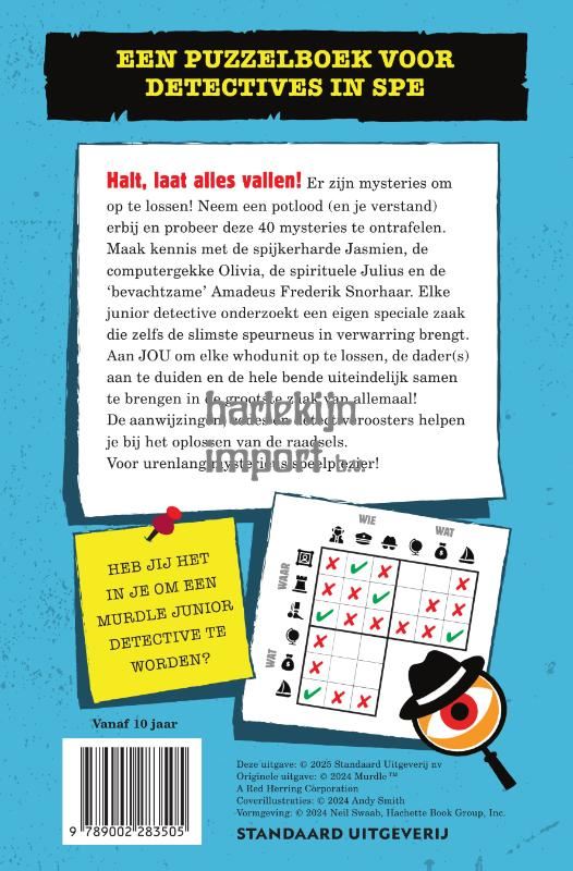 Blijf staan en laat alles vallen: er zijn mysteries om op te lossen! Neem een potlood (en je verstand) erbij en probeer deze 40 mini-mysteries te ontrafelen. Maak kennis met de spijkerharde Jasmien, de computergekke Olivia, de spirituele Julius en de bevachtzame Amadeus Frederik Snorhaar. Elke junior detective onderzoekt een eigen speciale zaak die zelfs de slimste speurneus in verwarring brengt. Aan jou om elke whodunit op te lossen, de dader(s) aan te duiden en de hele bende uiteindelijk samen te brengen in hun grootste zaak van allemaal! De aanwijzingen, codes en detectiveroosters helpen je bij het oplossen van de raadsels. Voor urenlang mysterieus speelplezier!