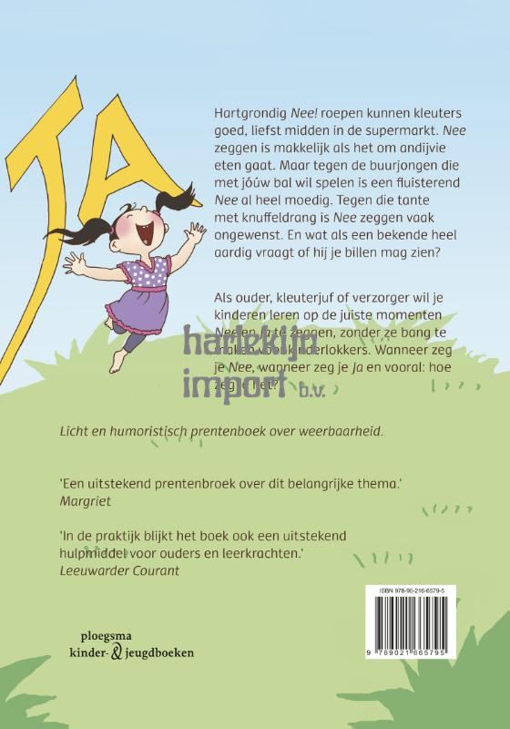 Hartgrondig Nee! roepen kunnen kleuters goed, liefst midden in de supermarkt. Nee zeggen is makkelijk als het om andijvie eten gaat. Maar tegen de buurjongen die met jóúw bal wil spelen is een fluisterend Nee al heel moedig. Tegen die tante met knuffeldrang is Nee zeggen vaak ongewenst. En wat als een bekende heel aardig vraagt of hij je billen mag zien? Als ouder, kleuterjuf of verzorger wil je kinderen leren op de juiste momenten Nee en Ja te zeggen, zonder ze bang te maken voor kinderlokkers. Wanneer zeg je Nee, wanneer zeg je Ja en vooral: hoe zeg je het?