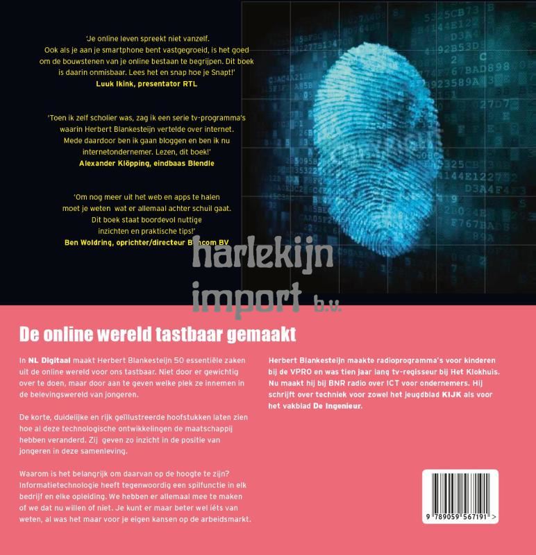 In NL Digitaal maakt Herbert Blankesteijn 51 essentiële zaken uit de online wereld tastbaar. Niet door er gewichtig over te doen, maar door aan te geven welke plek ze innemen in de belevingswereld van jongeren. De korte, duidelijke en rijk geïllustreerde hoofstukken laten zien hoe al deze technologische ontwikkelingen de maatschappij hebben veranderd en geven zo inzicht in de positie van jongeren in deze samenleving. Waarom is het belangrijk om daarvan op de hoogte te zijn? Informatietechnologie heeft tegenwoordig een spilfunctie in elk bedrijf en elke opleiding. We hebben er allemaal mee te maken of we dat nu willen of niet. Je kunt er maar beter wel íéts van weten, al was het maar voor je eigen kansen op de arbeidsmarkt.