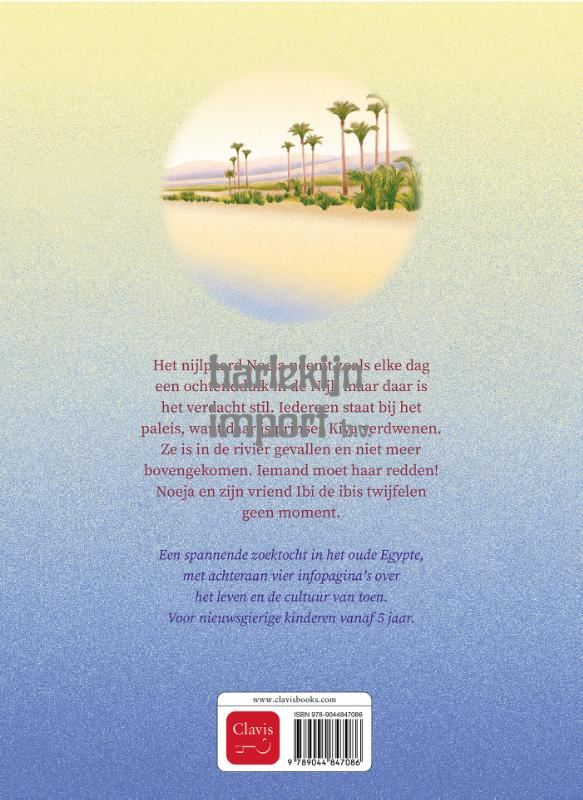 Het nijlpaard Noeja neemt zoals elke dag een ochtendduik in de Nijl, maar daar is het verdacht stil. Iedereen staat bij het paleis, want daar is prinses Kiya verdwenen. Ze is in de rivier gevallen en niet meer bovengekomen. Iemand moet haar redden! Noeja en zijn vriend Ibi de ibis twijfelen geen moment. Een spannende zoektocht in een verrassende setting: het oude Egypte! Voor nieuwsgierige kinderen vanaf 5 jaar.