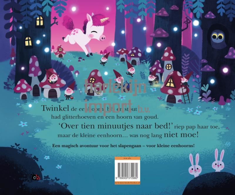 Twinkel, een ondeugende eenhoorn, moet over tien minuutjes naar bed. Maar ze heeft nog zoveel te doen! Dansen, springen, elfjes achtervolgen, bij de trollen op bezoek… In een spannende reis telt dit verhaal af tot het bedtijd is. Lukt het Twinkel om op tijd in bed te liggen?
