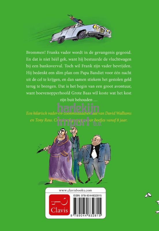 Een hilarisch vader-zoon-en-misdaadverhaal van David Walliams en Tony Ross. Crimineel grappig, voor boefjes vanaf 9 jaar. Brommen! Franks vader wordt in de gevangenis gegooid. En dat is niet héél gek, want hij bestuurde de vluchtwagen bij een bankoverval. Toch wil Frank zijn vader bevrijden. Hij bedenkt een slim plan om papa bandiet voor één nacht uit de cel te krijgen, en dan samen stiekem het gestolen geld terug te brengen. Dat is het begin van een groot avontuur, want boevenopperhoofd Mr Big wil koste wat het kost zijn buit behouden …